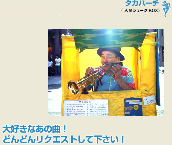 街中に突然現れる黄色い箱。自動販売機?いえいえ人間ジュークBOXです。メニューを見ながらお好きな曲を決めて、コインを投入すると……。あら、びっくり!生演奏で、リクエストにお答えします!21世紀のテクノロジーでも敵わない、なんとも楽しいジュークBOX。お楽しみ下さい!